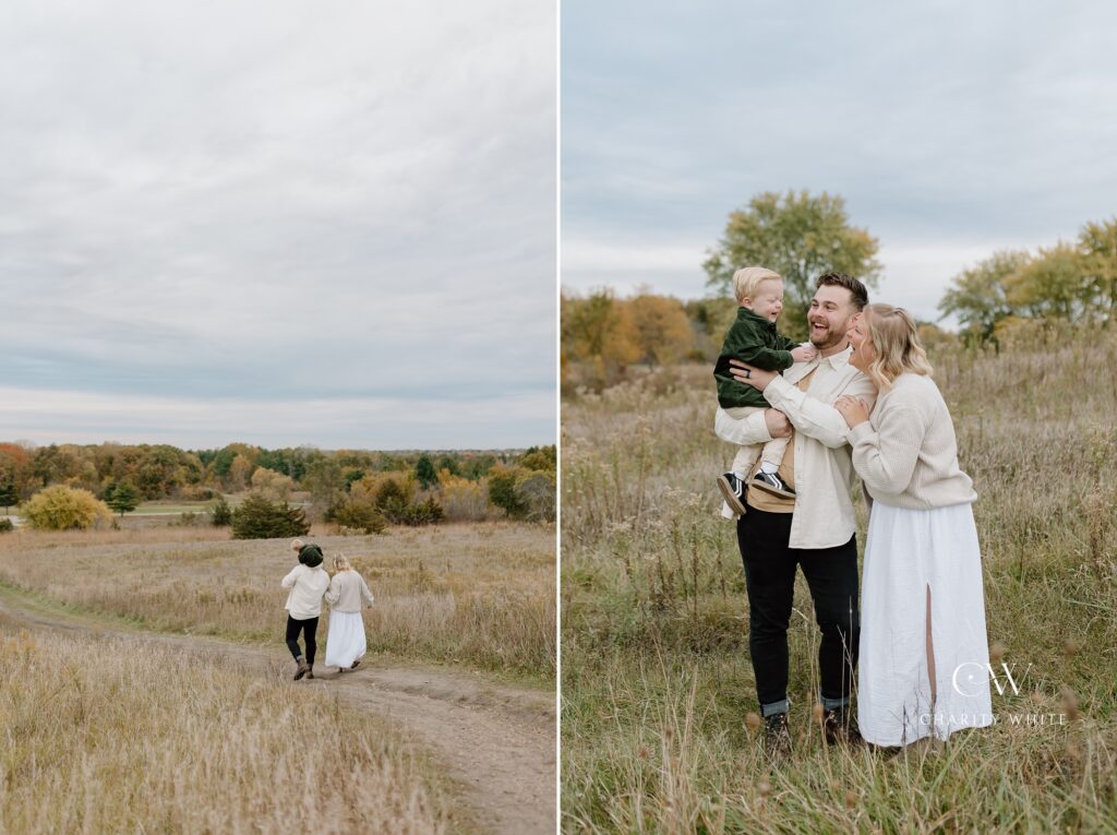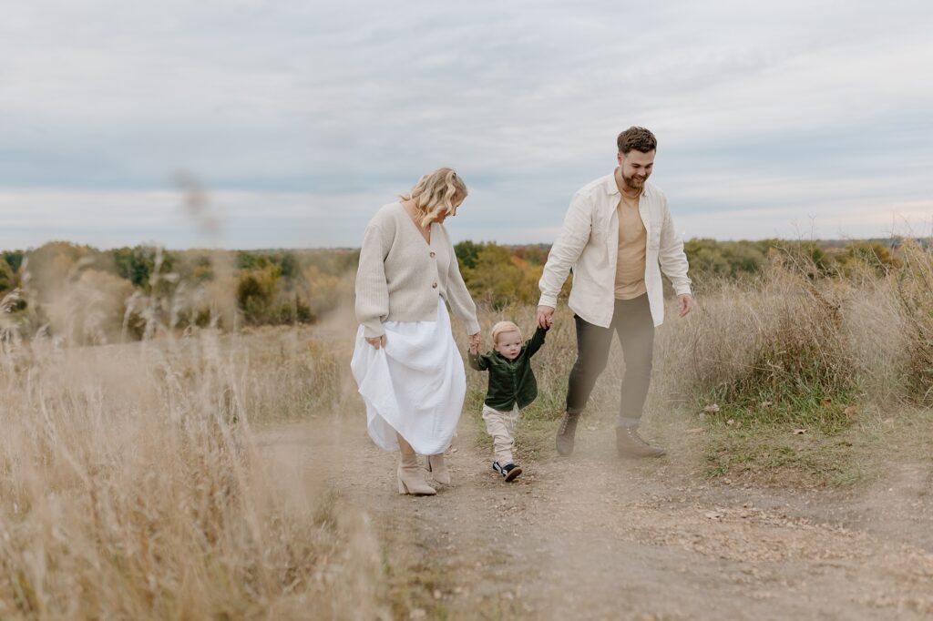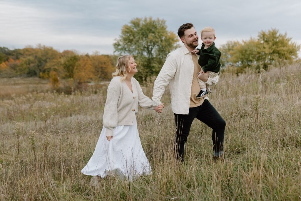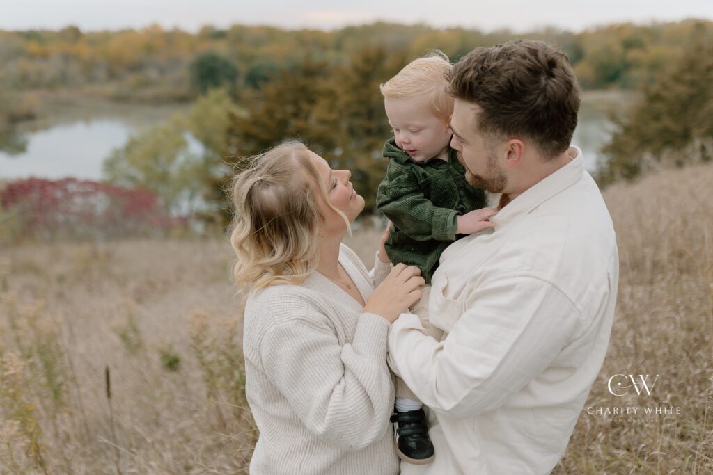 For this session, we met at one of our favorite locations: Oakhurst Forest Preserve in Aurora. It’s a go-to spot for many of my clients looking for Aurora family photos because the preserve offers open fields, tall grass, a lake with bridges, and peaceful water views from the hilltop. Even on a chilly, cloudy fall day, we had perfect light and earthy tones that made the photos pop. On this day, the cooler air encouraged extra snuggles—which is always a win.