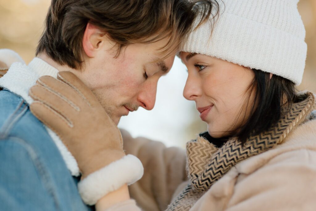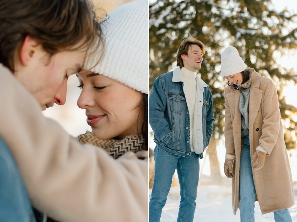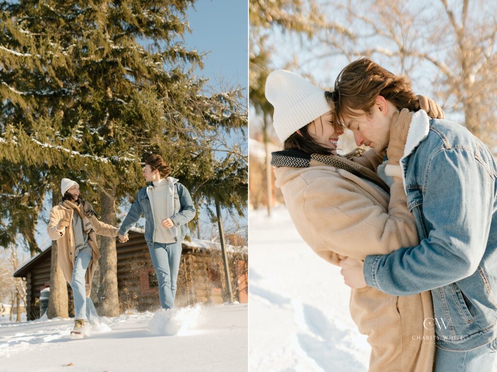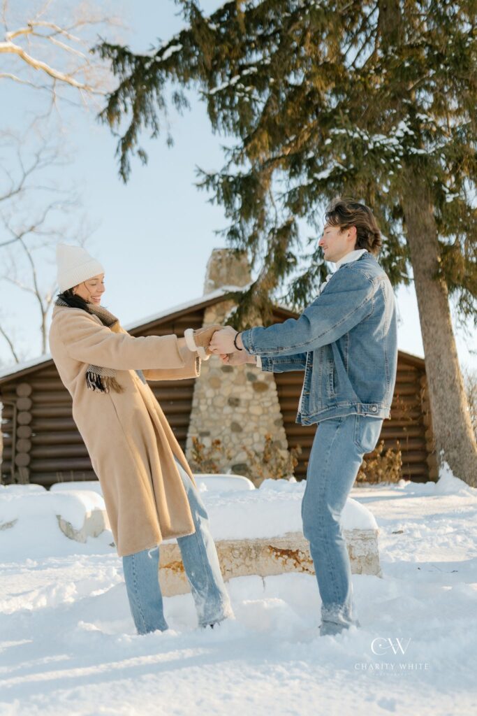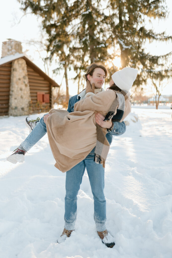 For this snowy couples photoshoot in particular, I had a vision for neutral clothing, with an elevated but cozy style. For the location, I envisioned them in a forest-type setting and then my mom reminded me about the adorable little log cabin in Lombard that I grew up visiting all my life. We use to run around the fields and forest here, and held many events at the cabin with our church and home school co-op. It was the PERFECT backdrop that pulled together the wintery vibes I was dreaming of!