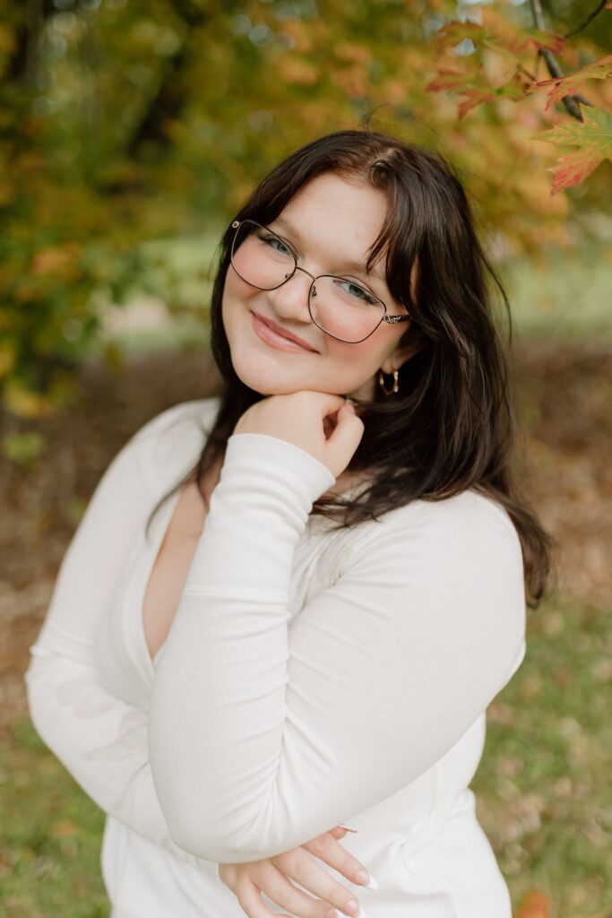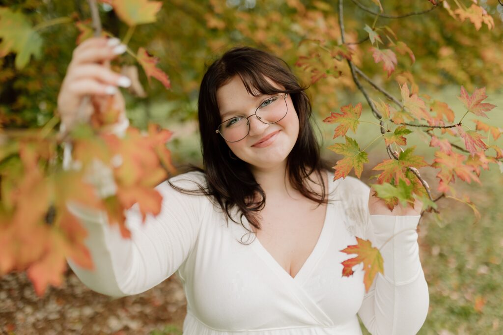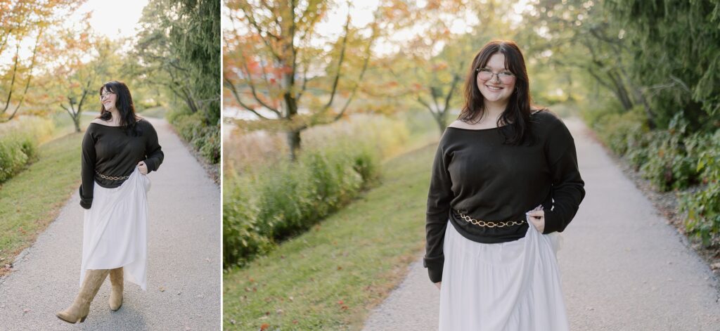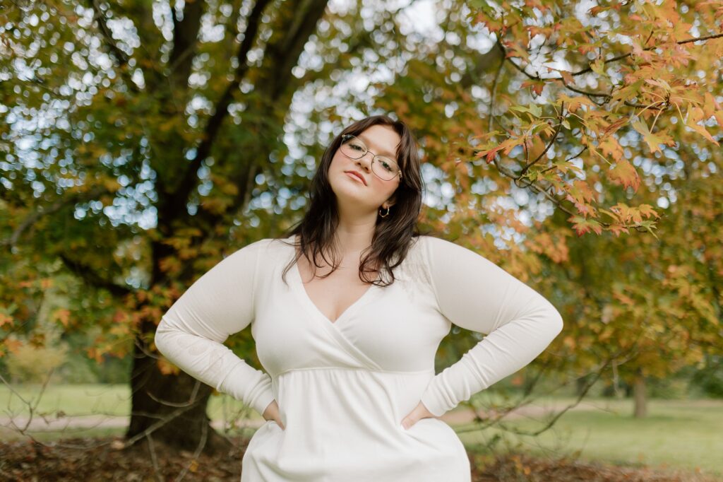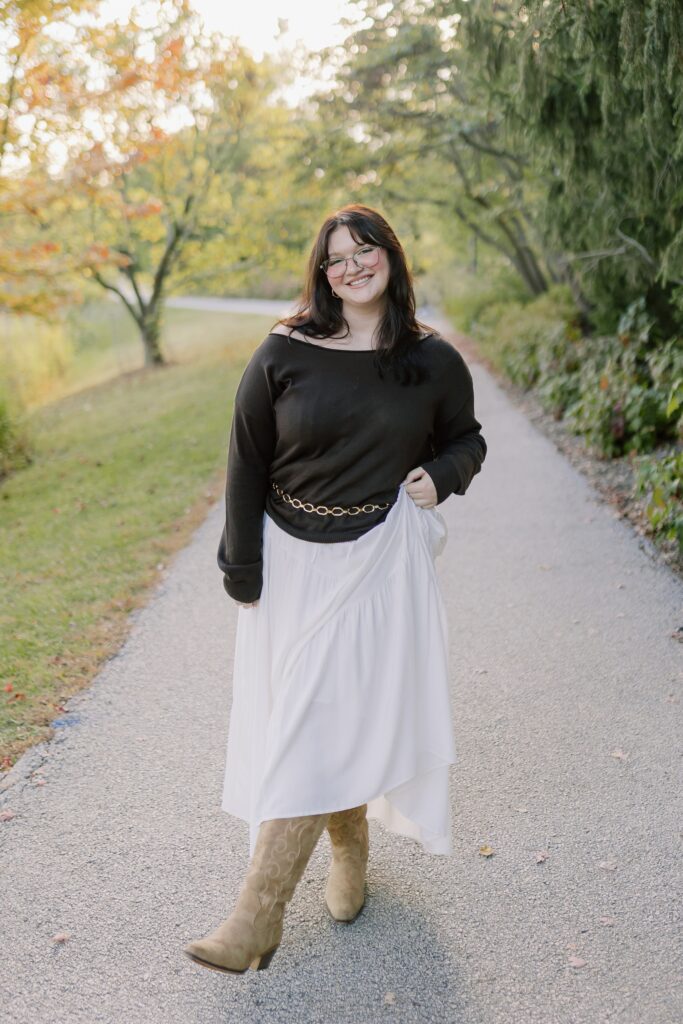 The Morton Arboretum is filled with literally endless photo opportunities. From lush gardens to varied tree groves representing different foliage from around the world- there’s really no limit to what you can dream up for your senior photos. For Cassy, we knew she wanted to highlight the vibrant colors, so that meant heading to the maples and oaks for those beautiful tones. We stopped at random spots that stood out along the route, and then ended in the stunning spruce grove. Side note: you do need to reserve a photography permit, so keep that in mind if you want senior photos at the Morton Arboretum.